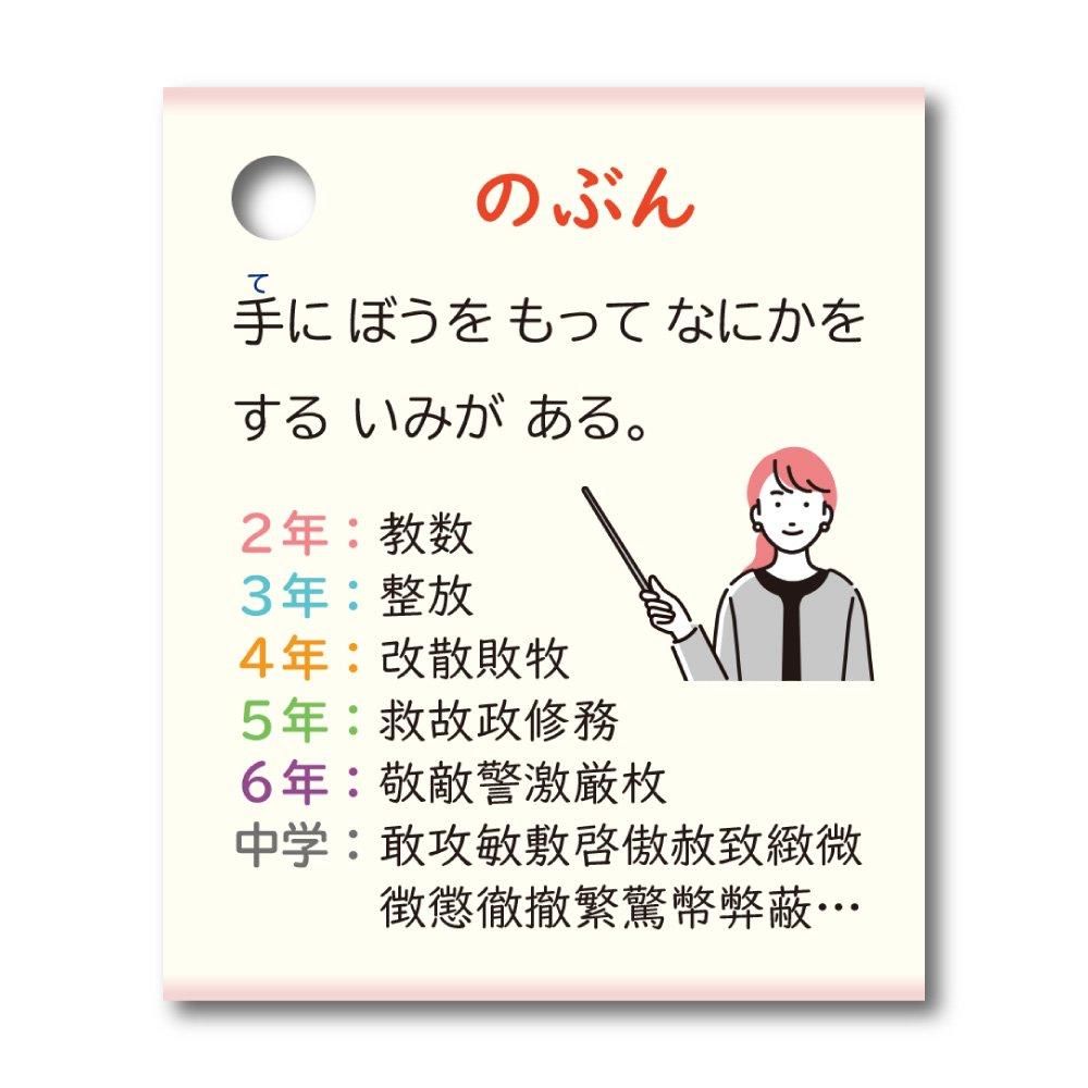 しかし、漢字には同じ部品がたくさん使われています。とくに2〜3年生で習う漢字に登場する部品の名前をおぼえると小学校で習うたくさんの漢字がとてもおぼえやすくなります。どうして部品の名前をおぼえるのが有効かというと、多くの子どもがまちがえやすい、おぼえにくい漢字の細かい部分を言葉ではっきりと区別できるようになるからです。