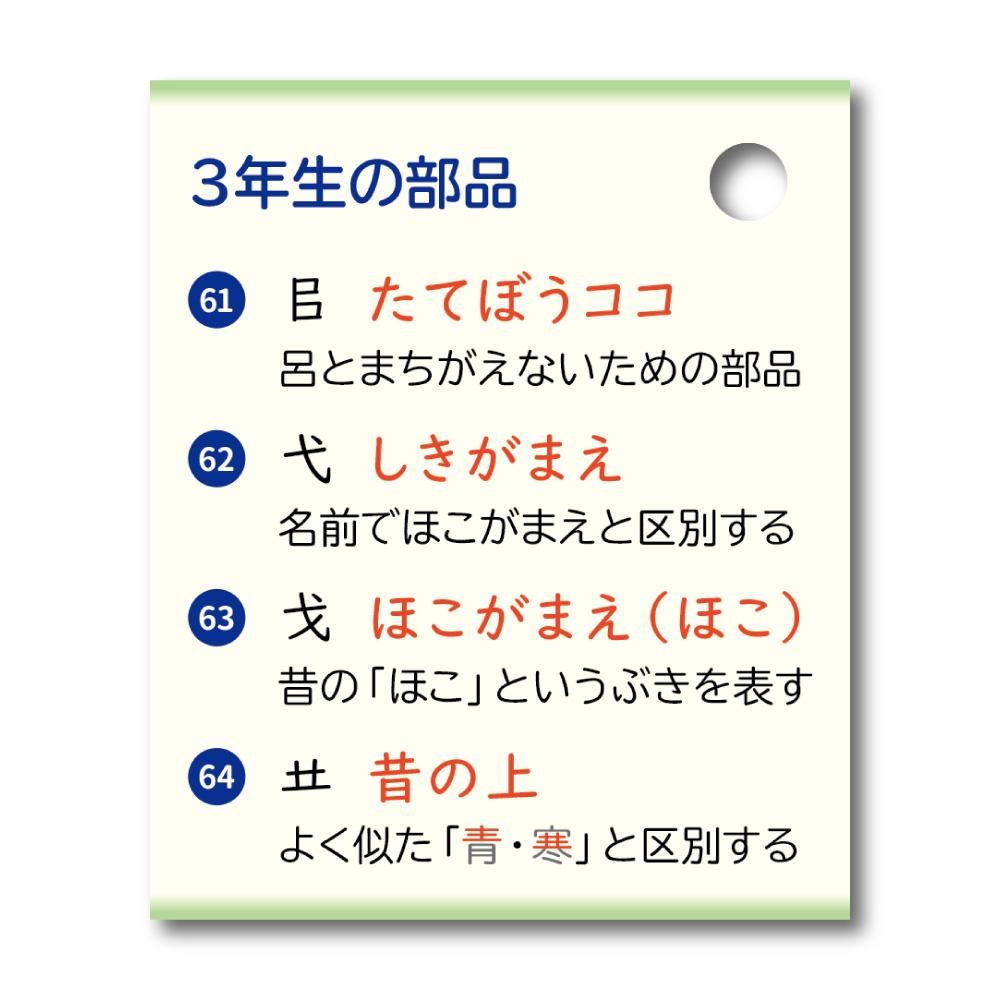 漢字にはよく似たカタチがたくさんあります。しかし、習う漢字がどんどん増えていく高学年以降ではよく似たカタチに混乱して細かい部分をまちがえる、区別できなくて覚えられない子どもがとても多くなります。だから、2〜3年生の漢字に使われていたパーツ(部品)の名前をおぼえるのがオススメです。